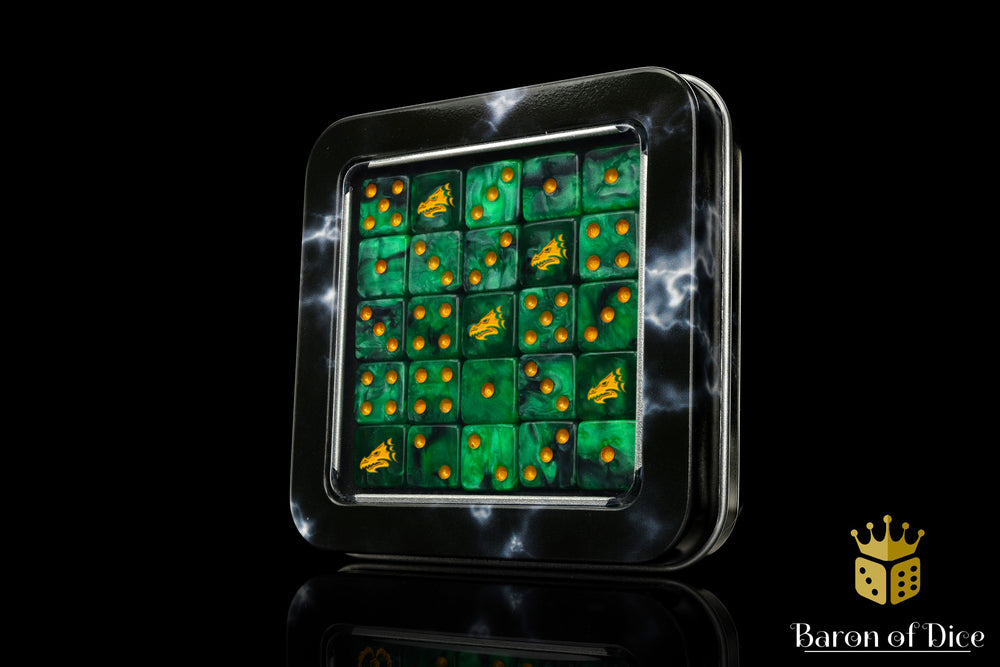 Onto the Fires of Battle!  These contain a base of dark emerald green with veins of charcoal black and inlaid with a metallic gold; resin 16mm dice.  The symbols are on the 6 side. These dice come in round corner, square corner, or 12mm mini; choose wisely! Our premium dice now come in a unique reusable tin.