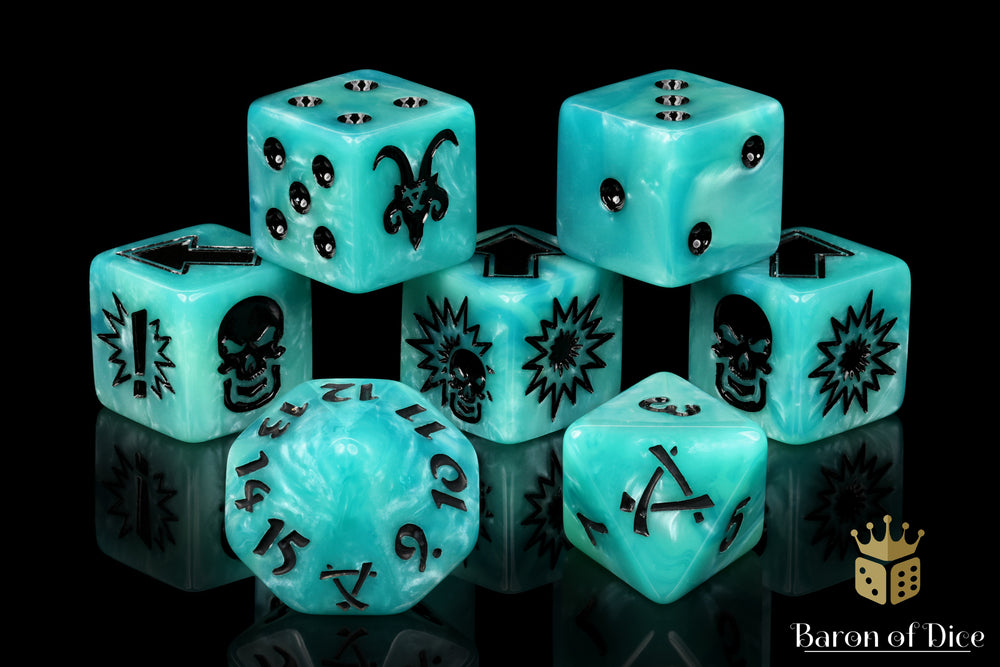 Our premium hand swirled resin dice contain ghastly azure blues swirled with undead greens and inlaid with a pure black. All symbols are on the 6, 8, and 16 sides, please choose a design to complement your army!