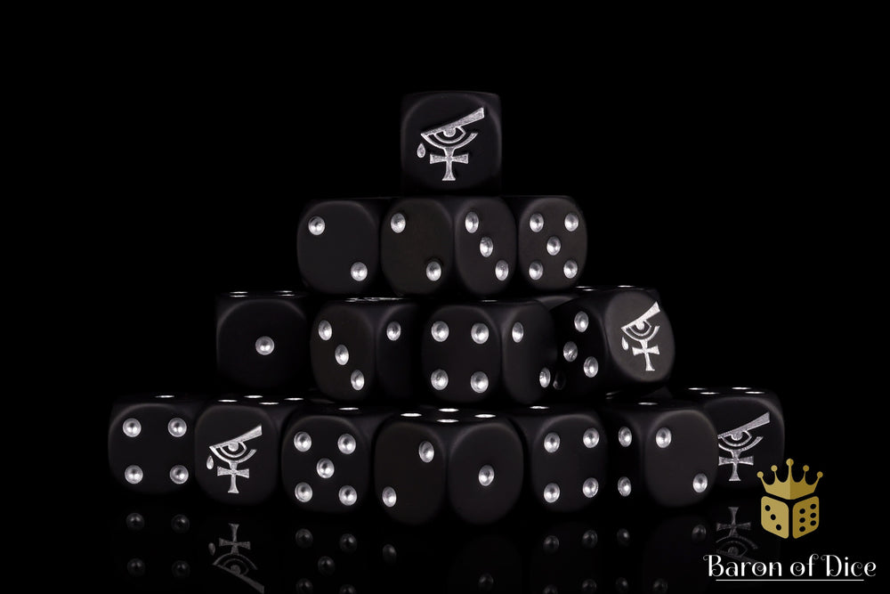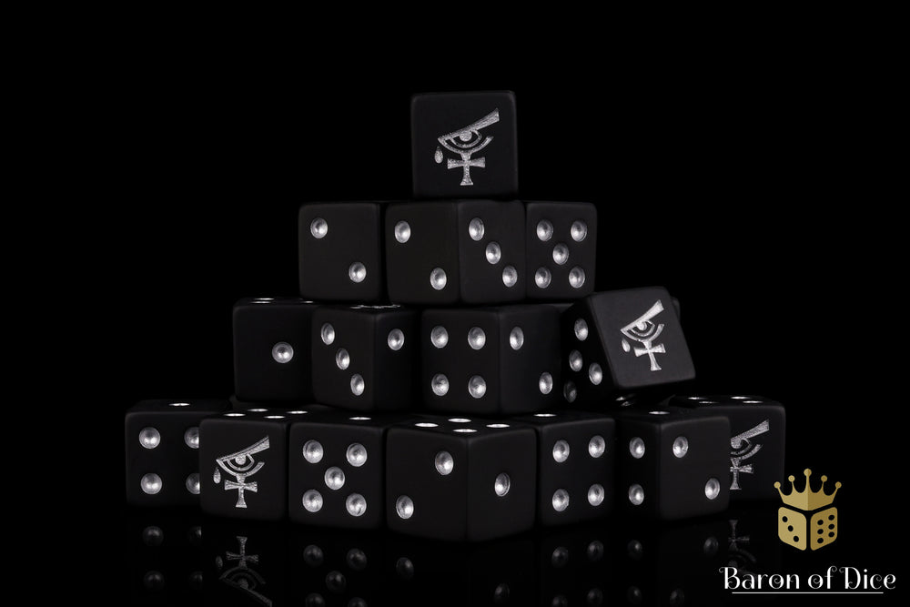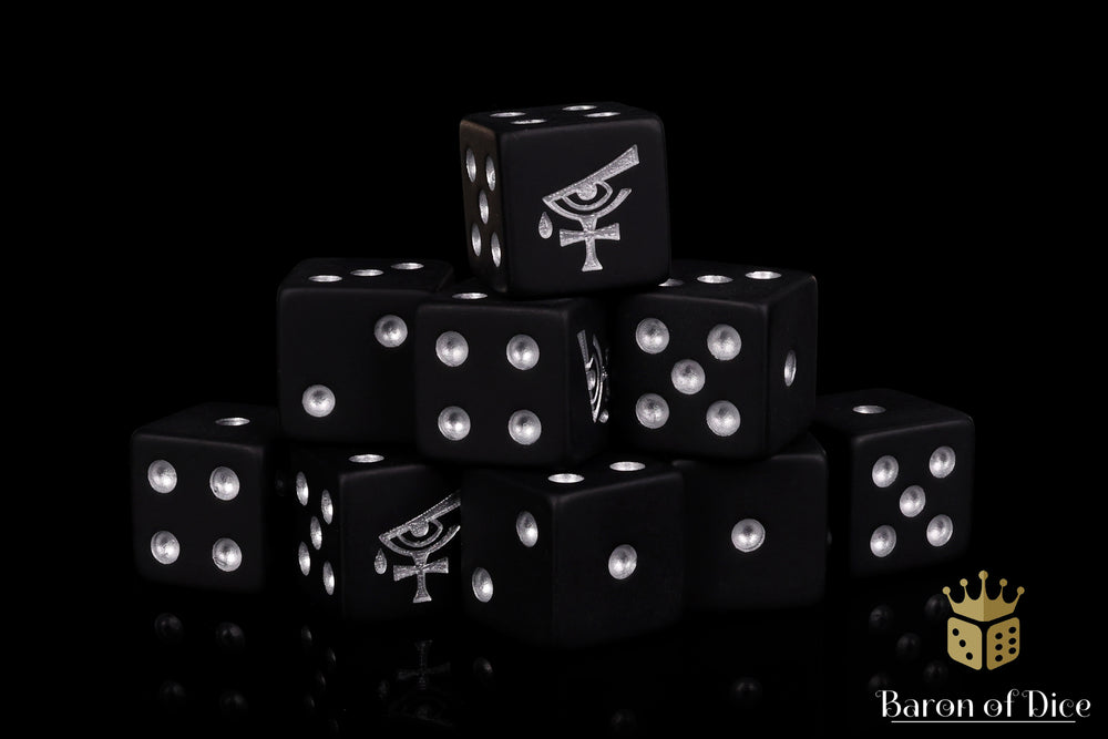 These contain a base of pure, warp black and inlaid with a metallic silver; resin 16mm dice. The symbols are on the 6 side. Our premium dice come in unique reusable metal tins.