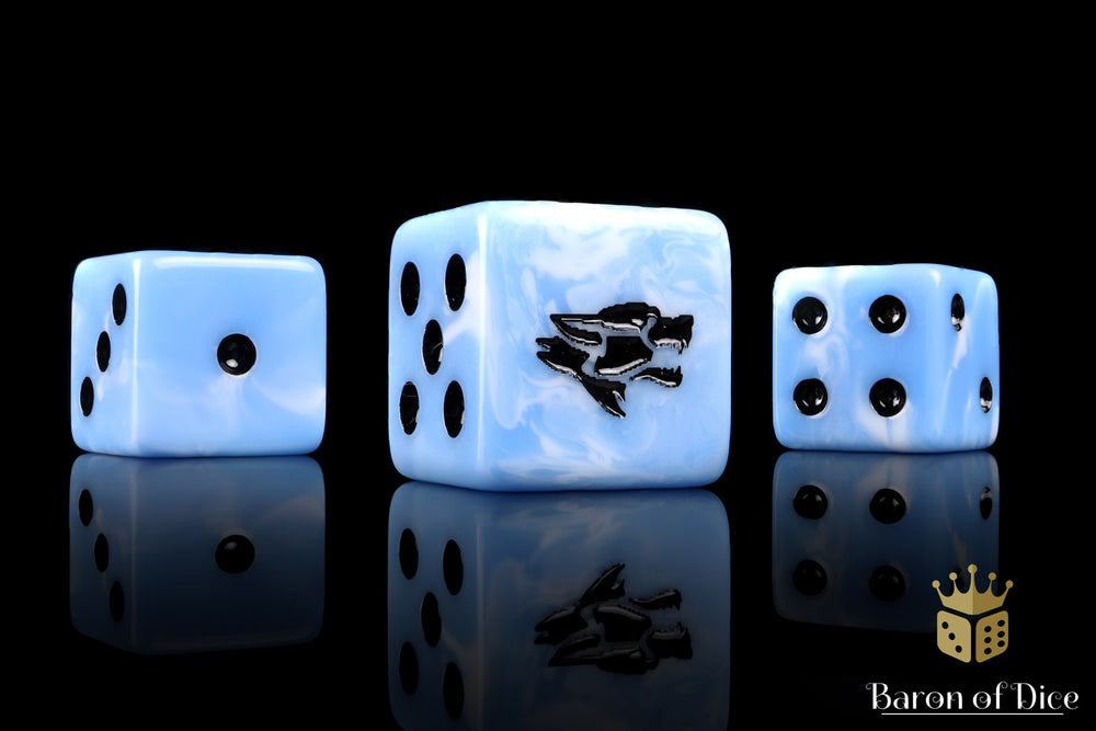 These contain a base of frosty blues swirled with frozen white veins and inlaid with a pure black; resin 16mm dice.  The symbols are on the 6 side.  These dice have an option of round corner, square corner, or 12mm mini; choose wisely! Our premium dice now come in a unique reusable tin.
