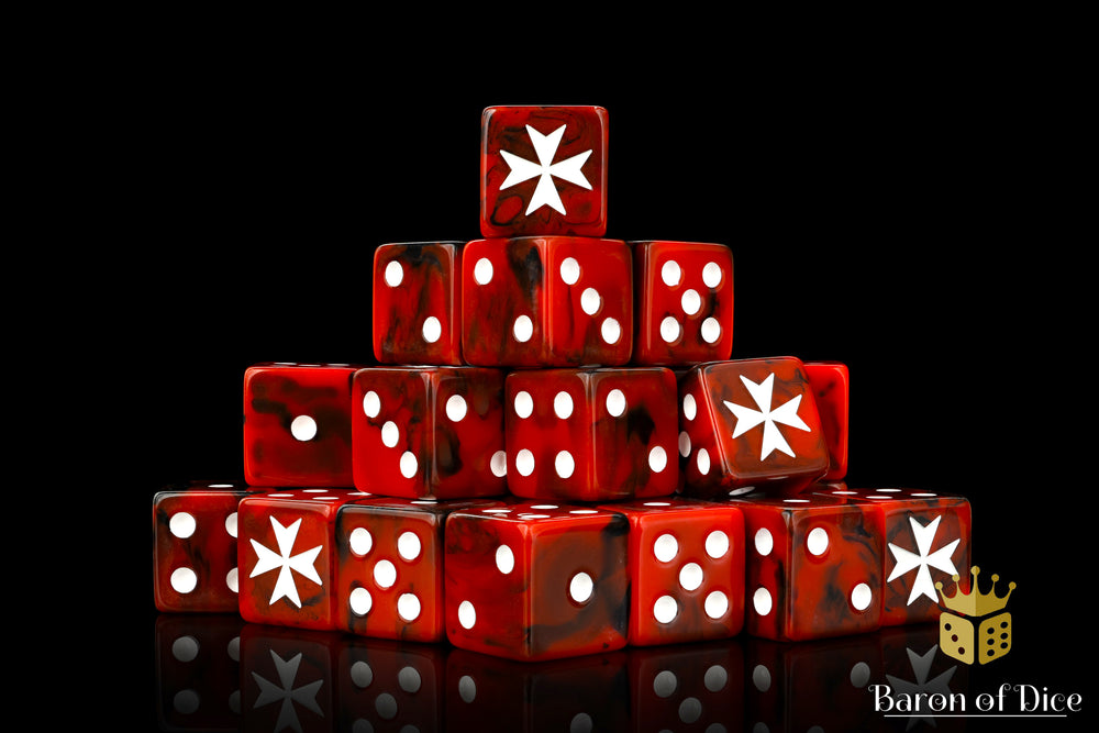Featuring a mixture of righteous reds swirled with a pure black and inlaid in honorable white; resin 16mm dice.  The symbols are on the 6 side.  These dice now come in the option of round corner or square corner; choose wisely!  Our premium dice come in unique reusable tins.
