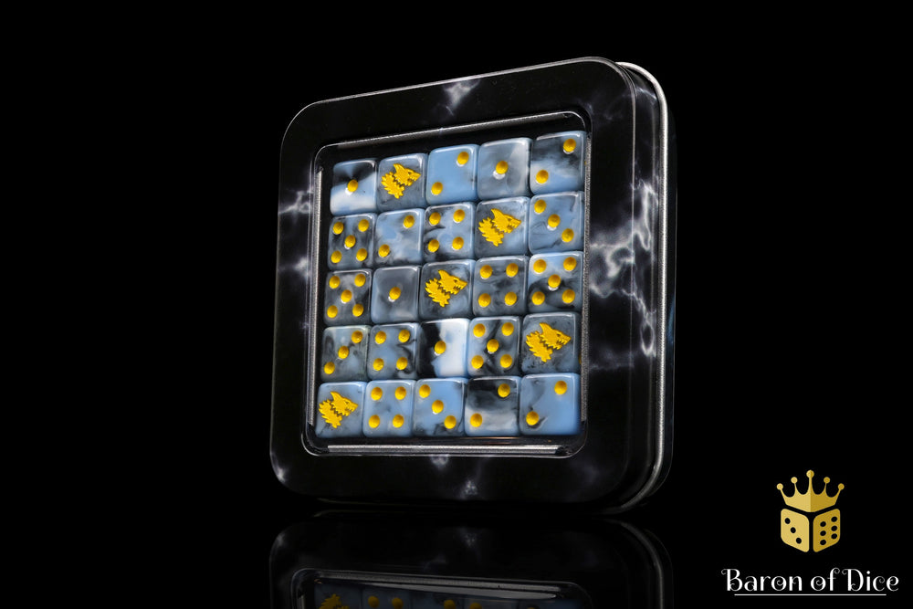 These contain a mix of melting blue and icy white hues swirled with a noble black and inlaid in a pure white; resin 16mm dice. The symbols are on the 6 side. These dice come in round corner, square corner, or 12mm mini; choose wisely! Our premium dice now come in a unique reusable tin.