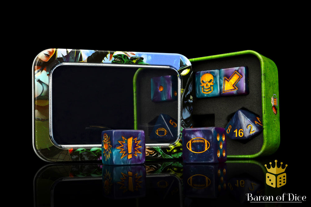 Our premium hand swirled resin dice contain stunning turquoise swirled with rich purples and inlaid with a metallic gold. All symbols are on the 6, 8, and 16 sides, please choose a design to complement your army!