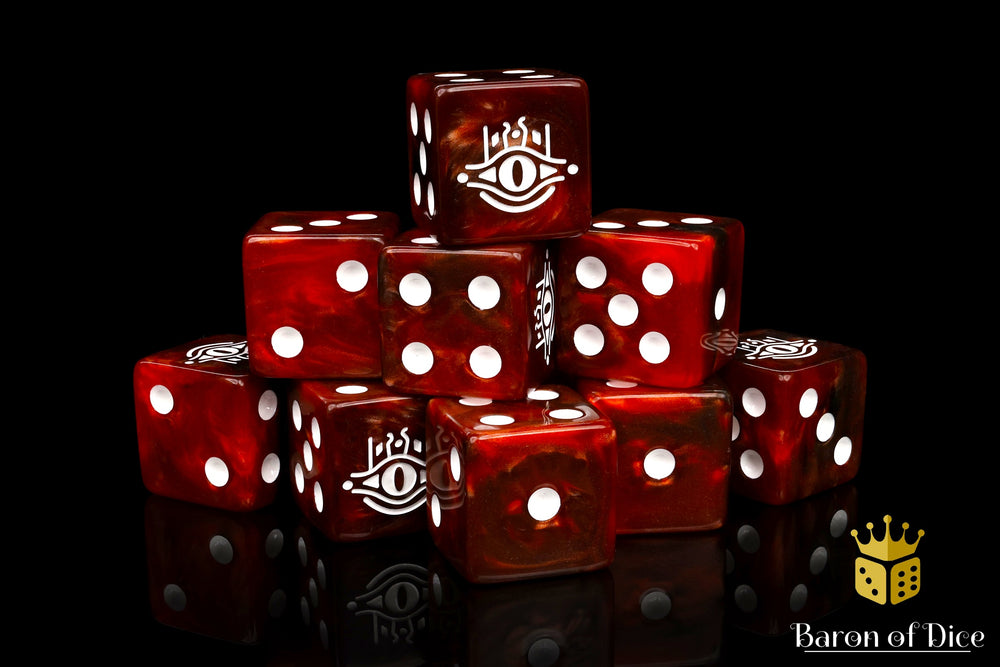 These contain a mix of vile reds swirled with ominous blacks and inlaid with an eerie white; resin 16mm dice. The symbols are on the 6 side. These are square dice. Our premium dice now come in a unique reusable tin when purchased in x25 and x50 count.