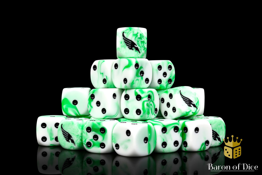 These contain a base of tranquil Elven whites swirled with forest greens and inlaid with a pure black; resin 16mm dice. These are matte finish. The symbols are on the 6 side. These dice have an option of round or square corner, choose wisely! Our premium Kings of War (KoW) dice come in a unique reusable, KoW exclusive tin.
