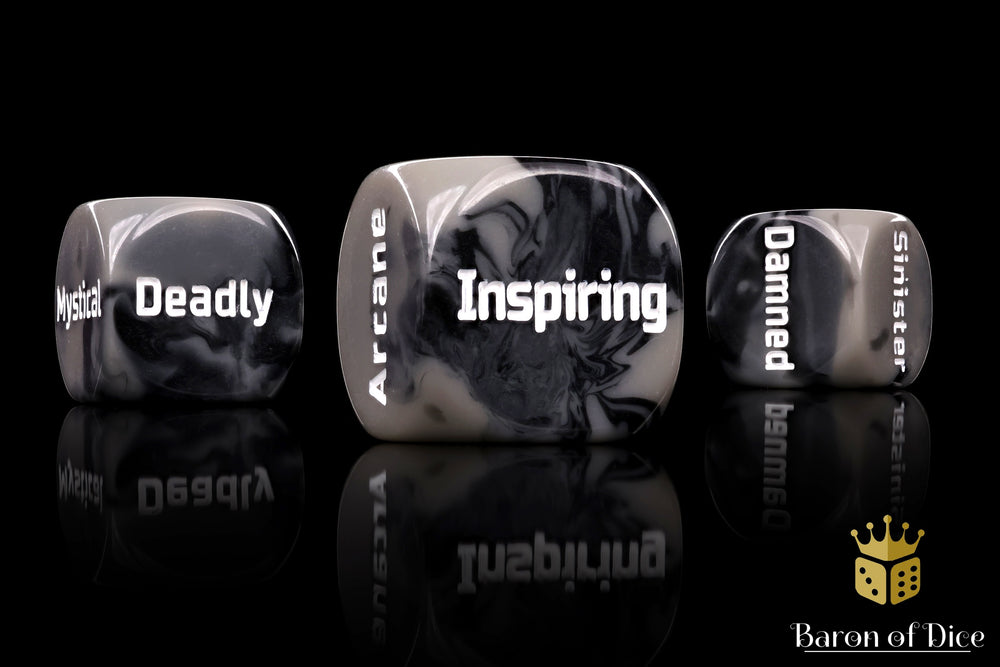 Ready to start using terrain rules?!  These contain a combination of rocky greys swirled with warp black veins and inlaid with an easily readable white; resin 16mm dice.  The symbols are on the 6 side. Make your table play that much quicker, roll these out and set them beside the terrain, gloriously simple.