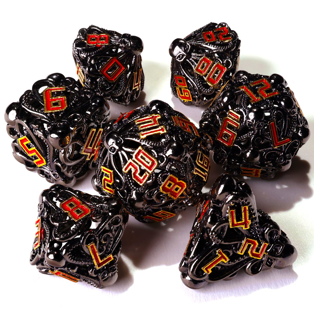 This set is made from shipwreck steel, these metal dice are ready to blow your mind! Featuring krakens, octopus, and squid designs across each die, in polished steel with bright red inlay, these are ready to burst from the depths; premium metal 20mm dice set containing D4, D6, D8, D10, D10, D12, and D20.