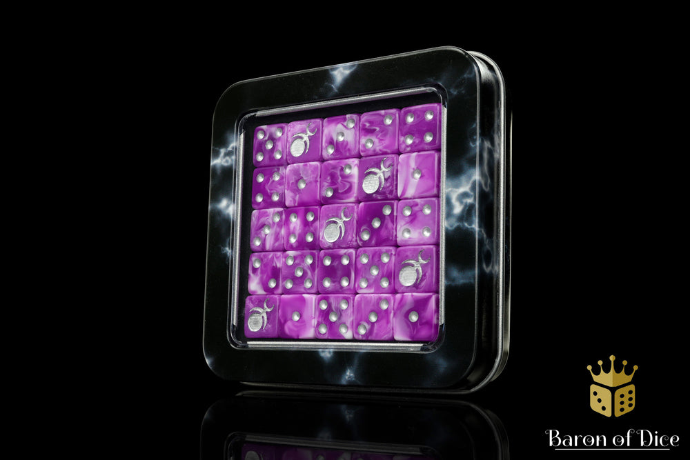 Embrace your indulgences!  These contain a mix of lustful purples swirled with silken whites and inlaid with a metallic silver; resin 16mm dice. The symbols are on the 6 side.  These dice come in round corner, square corner, or 12mm mini options; choose wisely! Our premium dice come in a unique reusable tin.