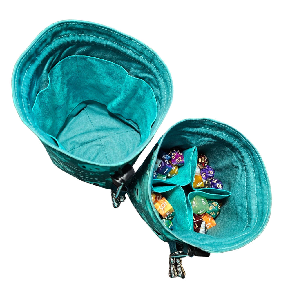 With a mix of spectral greens and ghastly teals, these bags are as practical as they are stylish. Each Legendary Wares dice bag features a unique free-standing design to help minimize table space and keep you nice and organized. Open up the large bag and you’ll be greeted with four interiors pockets to maximize your customization and ensure you can grab your favorite dice at a moment’s notice.