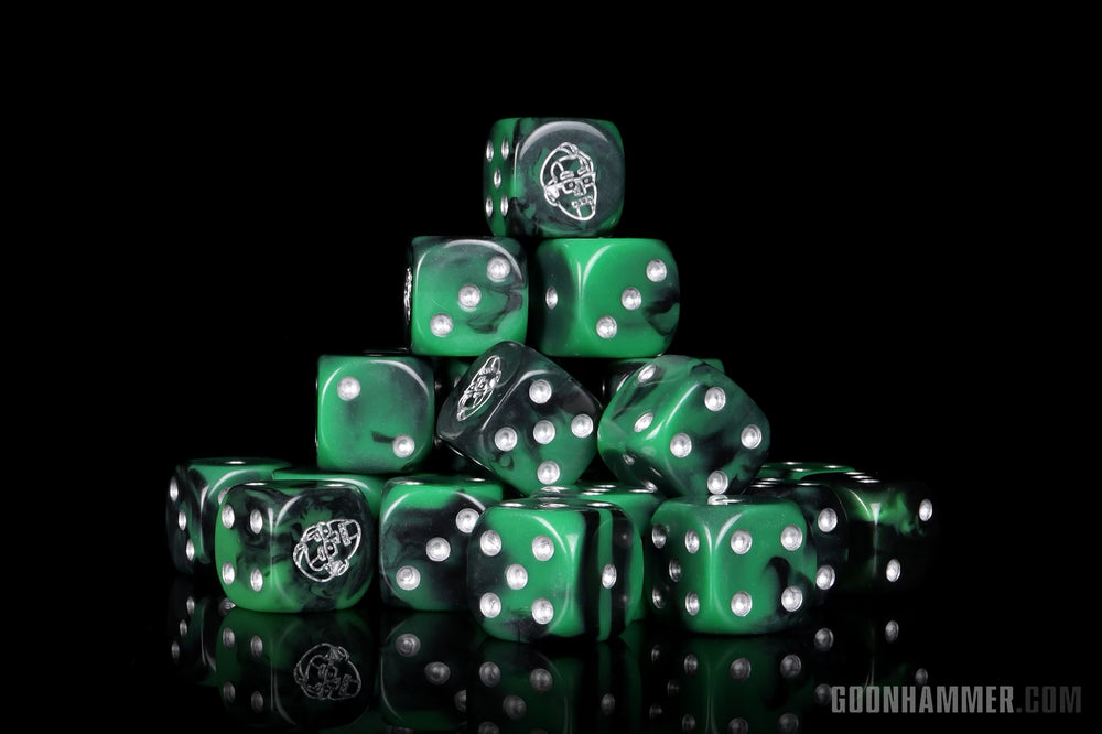 These contain a mix of honorable green hues swirled with pure blackness and inlaid in a metallic silver; hand-mixed resin 16mm dice. The symbols are on the 6 side.