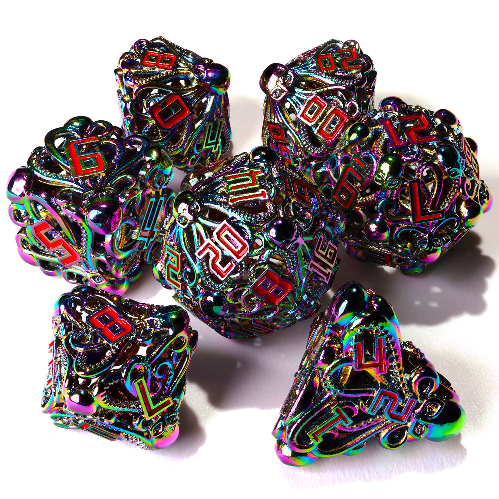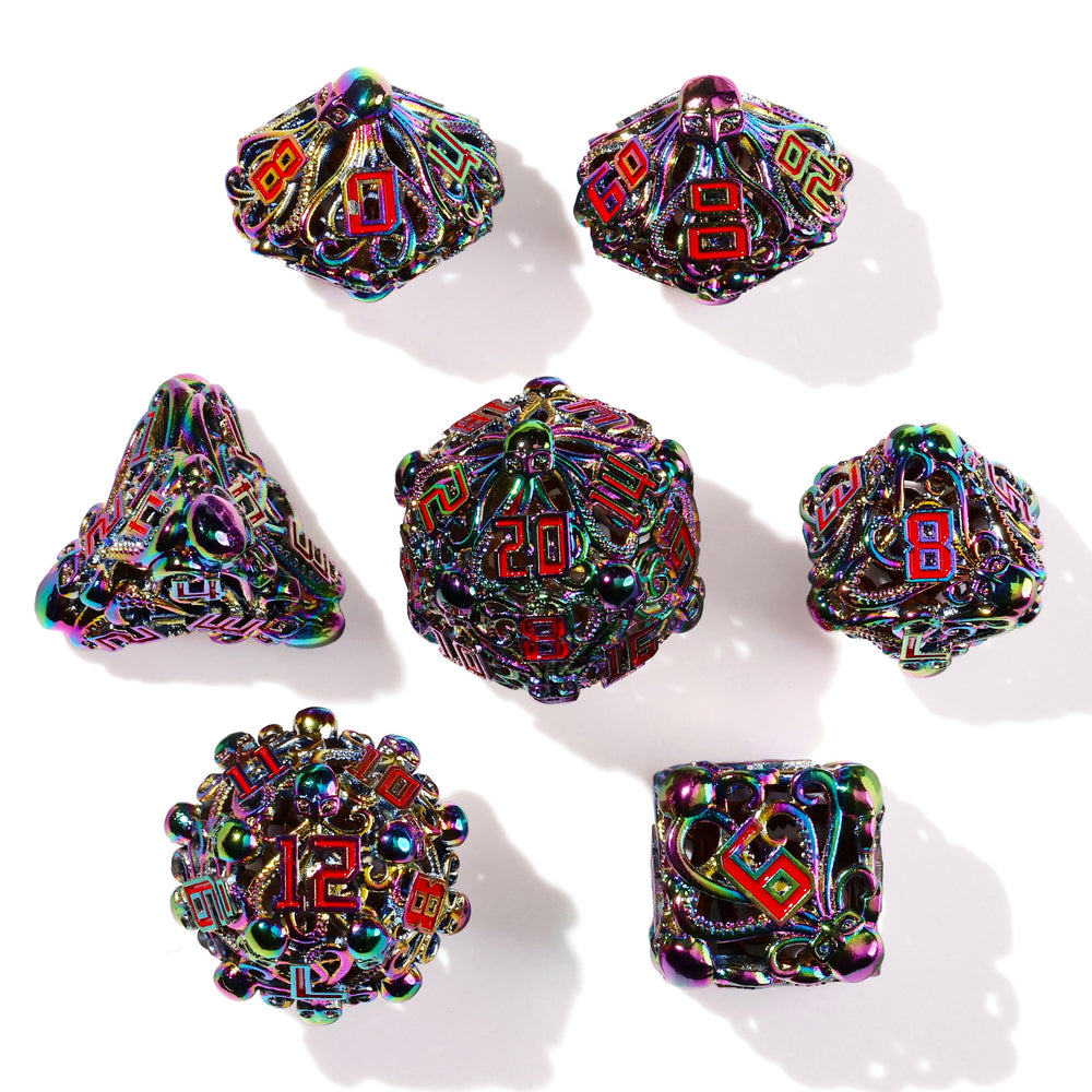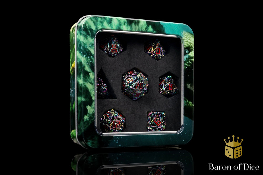 This set is made from iridescent steel, honed to a glow. Cut from the Earth's veins, these metal dice are ready to blow your mind! Featuring krakens, octopus, and squid designs across each die, in iridescent steel, these are ready to burst from the depths; premium metal 20mm dice set containing D4, D6, D8, D10, D10, D12, and D20.