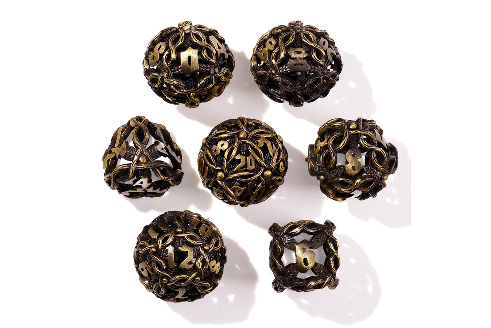 Forged by Mother Nature, fear her wrath! Vines, leaves and branches weaved form glorious math cubes. These dice are ready to blow your mind! With premium metal 20mm dice set containing D4, D6, D8, D10, D10, D12, and D20.