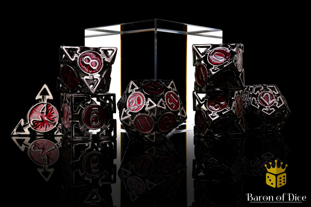 This set is made from darkened steel, oiled with use. Cut from the Earth's veins, these metal dice are ready to blow your mind! Featuring a custom compass design across each die, in shining steel, these are inlaid with bloody reds; premium metal 20mm dice set containing D4, D6, D8, D10, D10, D12, and D20.