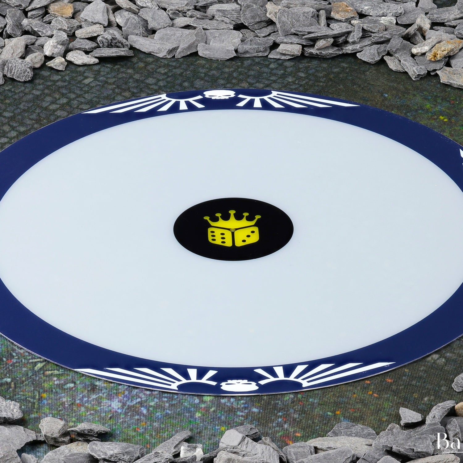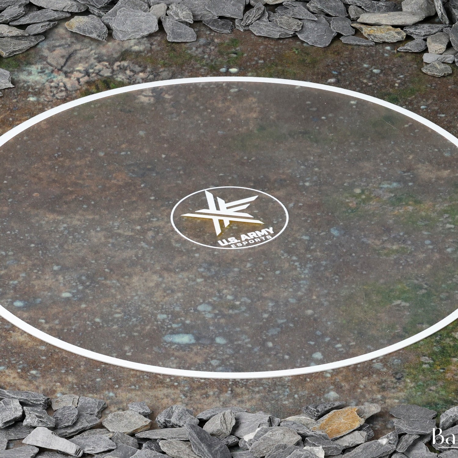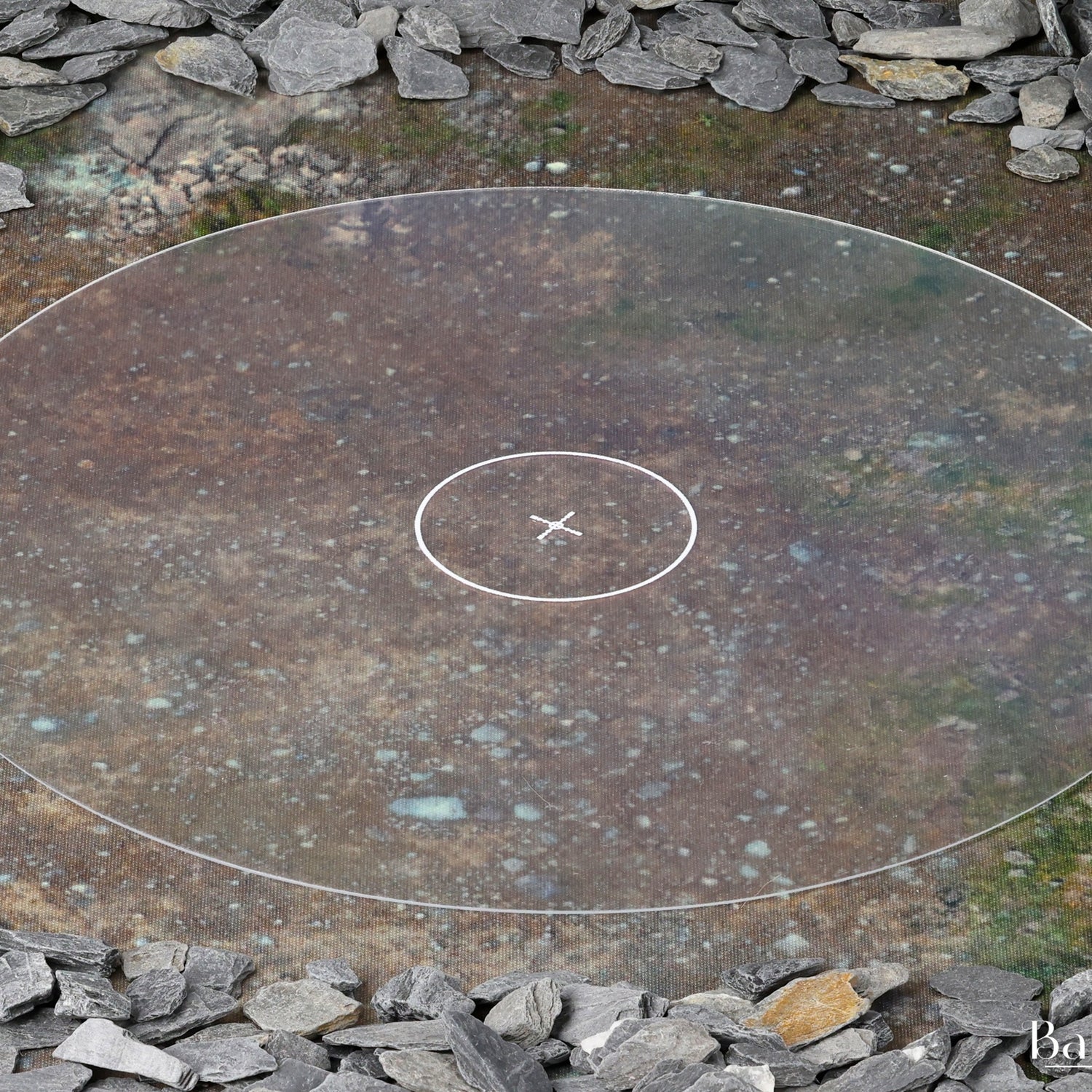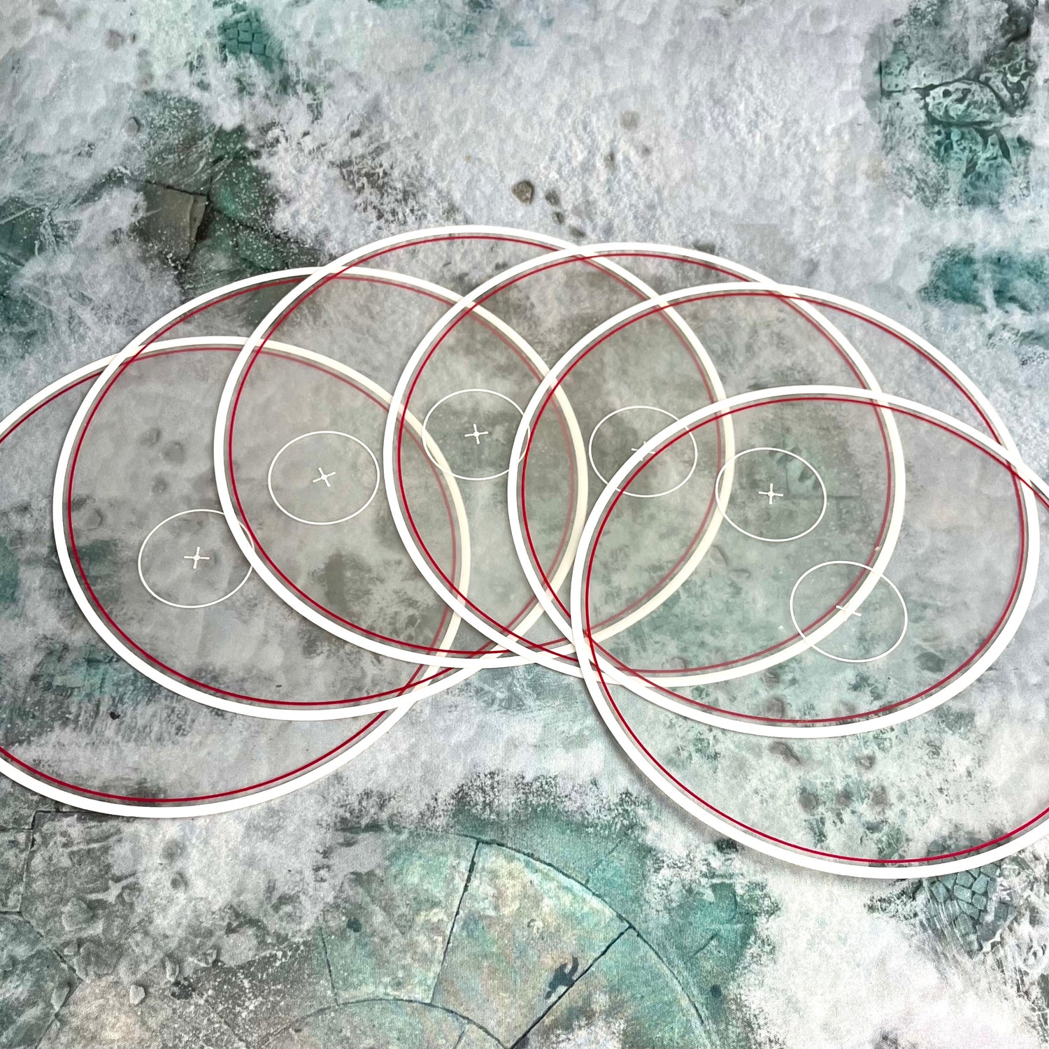 Let's discuss measurements! Starting in the center, there is a 1mm translucent circle, this is your "pinpoint" hole for placement on your game table, essential. The circle around the inside measures exactly 40mm to mark an objective token. Outside, the rim is exactly 192.4mm diameter, letting everyone know they have reached the objective. If you touch that line, you are in! Simple, effective, and clear.