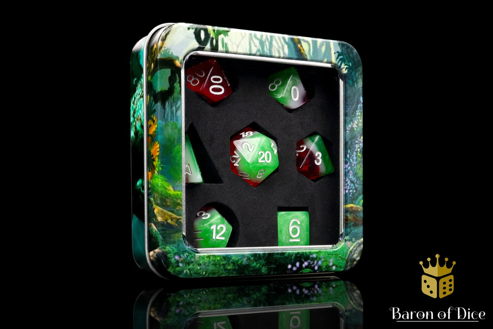 When these dice hit the table a sudden vigor awakes, you feel ready to encounter the renown winged Demi-God...Sure enough, you realize it's the beer in your other hand giving you this newfound courage, too late; nonetheless these are the best dice out there and the epic rolls leave you victorious! Our premium polyhedral dice come in unique metal tins!