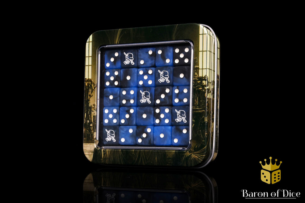 Atonement, Brothers. These contain a mix of radioactive combination of drab blues swirled with veins of scorched black featuring a matte finish and inlaid with a crisp white; resin 16mm dice. The symbols are on the 6 side. These dice have an option of round corner, square corner, or 12mm mini; choose wisely! Our premium dice now come in a unique reusable tin.