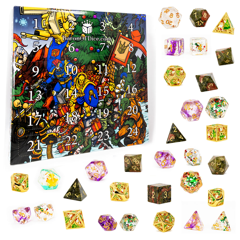 The BARON OF DICE DnD Mystery Calendar is here! This high-quality dice gift set contains a wide variety of RPG dice that’ll make your favorite tabletop gamer’s heart swell with joy.