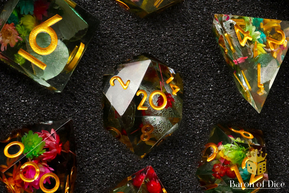 This set replicates the royal gardens of ol', with vines and roses captured within each die! The dice are hand polished sharp corners, unique amongst our collection. They are a crystal clear translucent swirled with a buds and freshly picked stems and inlaid with a metallic gold; premium hand-mixed resin 16mm dice set containing D4, D6, D8, D10, D10, D12, and D20.