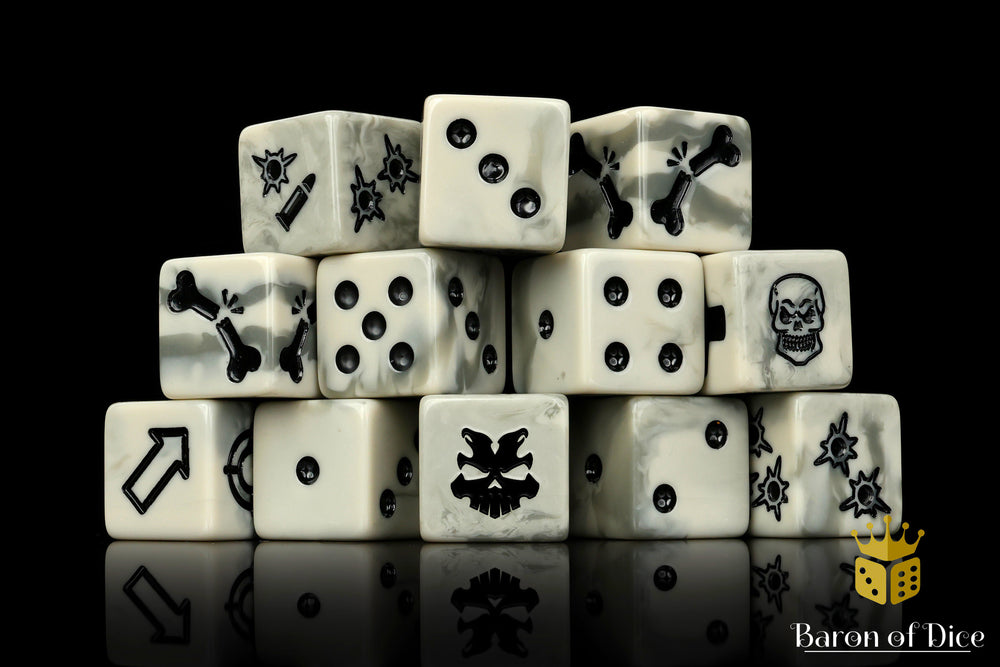 Our Skirmish sets contain full set of x12 specialized dice; 6 D6 with a symbol on the 6 side, 1 scatter, 2 firepower, and 3 injury dice compatible with Necromunda Game system. Each die has the same cohesive swirling; a mixture of radioactive fallout greys swirled with charred veins and inlaid with a pure black skull; resin 16mm dice. All dice are square corner and accompanied in a sweet metal tin surrounded by EVA foam. Show up in style!