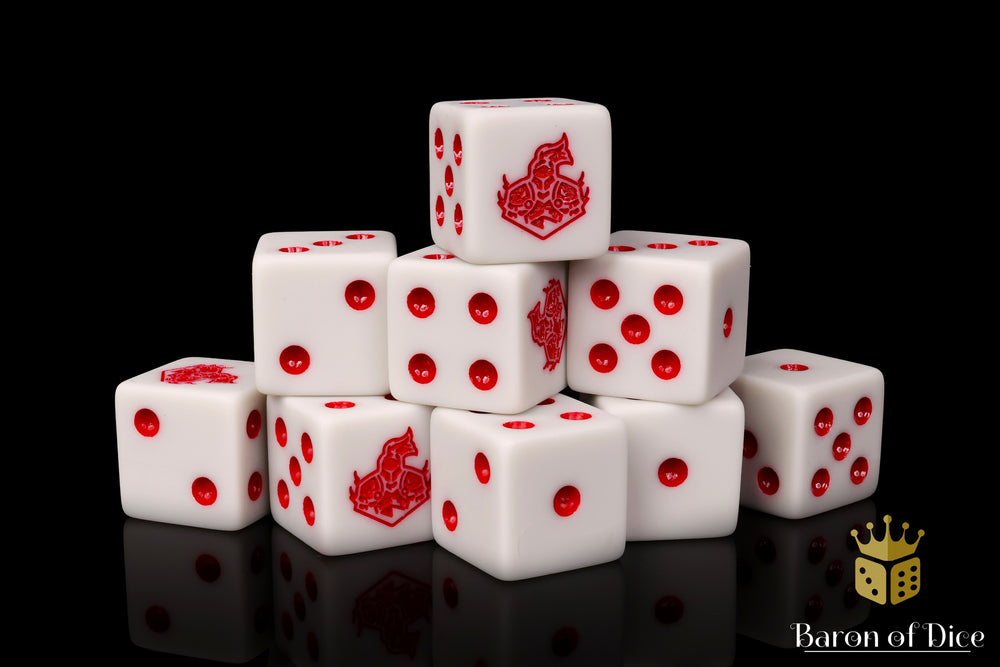 Featuring a base of marbled light greys and inlaid in a bright bloody red; resin 16mm dice. These are matte finish dice. The symbols are on the 6 side.