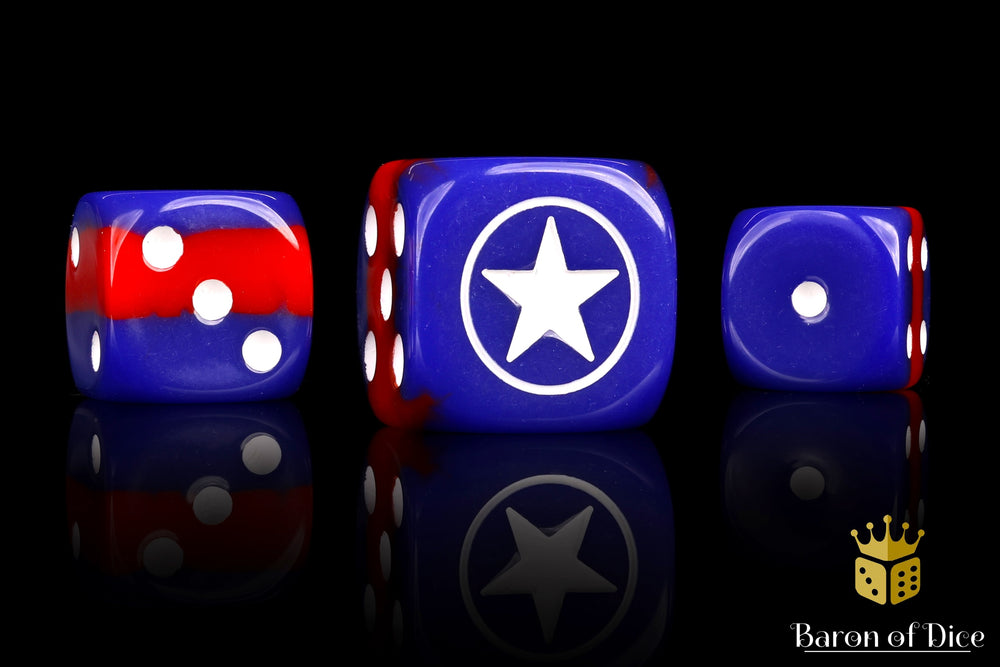These are hand layered resin dice, combining two colors layered like the North Korean flag. Featuring a royal blue and bloody red and inlaid with a pure white; resin 16mm round edge dice. The symbols are on the 6 side. Our premium dice come in metal reusable tins when purchased in x25 and x50 count quantities.