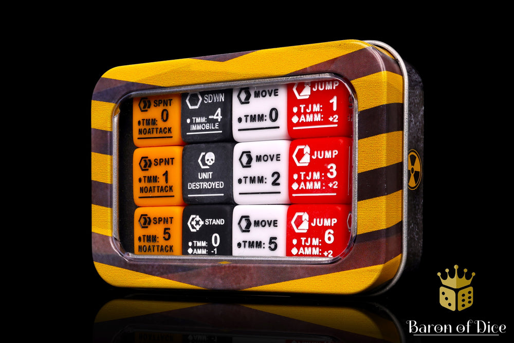 Gearing up for war, bring your Battle Robot to bear with the best wargaming dice at your disposal! Each set of first strike movement dice contains x12 specialized movement dice for your first strike battle robot battles encased in a unique reusable metal tin. Each die is hand-swirled resin, use these dice to simplify and speed up the games for you and your opponent!