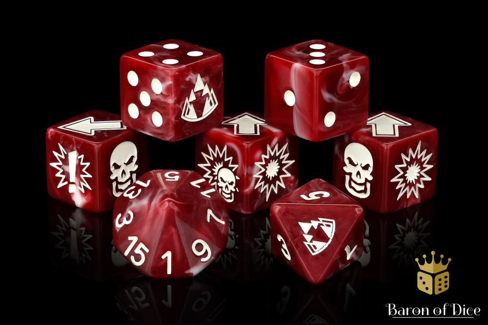 Our premium hand swirled resin dice contain bloody gristle swirled with shimmering cartilage and inlaid with a crisp white. All symbols are on the 6, 8, and 16 sides, please choose a design to complement your army!