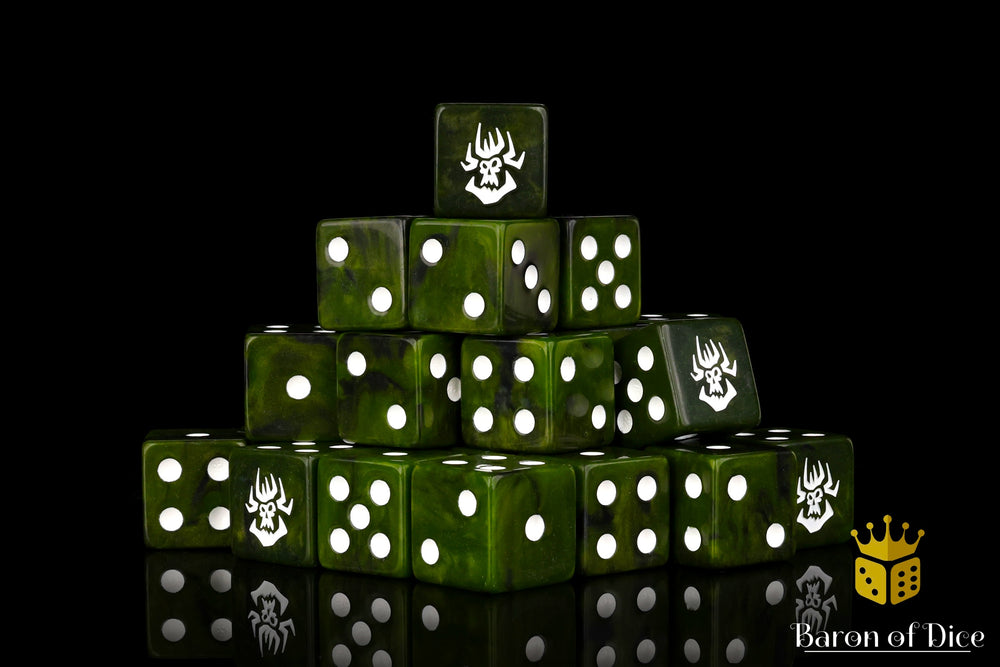 These contain a mixture of with swampy orc greens swirled with streaks of black ichor and inlaid with a pure white; resin 16mm dice. The symbols are on the 6 side. These dice have an option of round or square corner, choose wisely! Our premium dice come in a unique reusable tin.