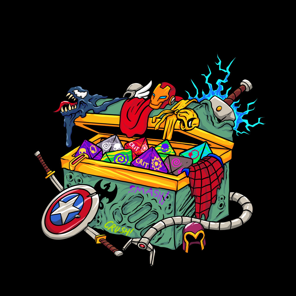 Everyone loves surprises! This box is bursting full of our Comic Book dice creations, all at a discount! Featuring new and old favorites, you are guaranteed a few sets of Comic Book dice inside every chest, featuring a retail value of $100 and $150 respectively.