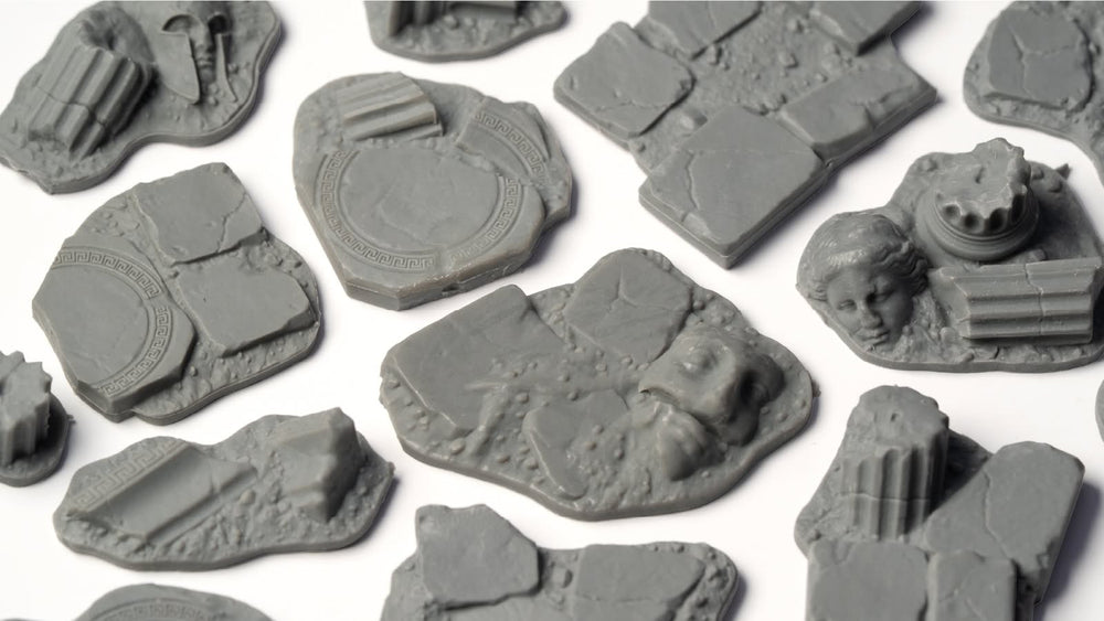 Temple Basing Bits are scaled fragments of architectural elements of a bygone ruined temple. Fragmented columns, broken pavements and sculptures, small pieces of ornamented friezes and sculptural panels, all with an antique classic flavour, are perfect for your ancient world reconstructions and sagas.