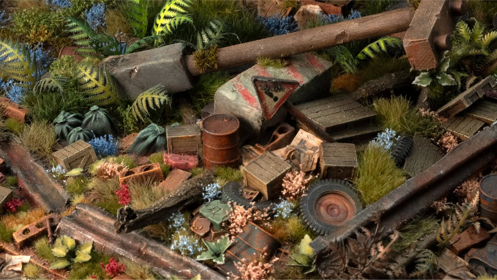 Lost in the debris of war across past, present, and future, Urban Warfare captures a world where factions have clashed and crumbled. Barrels, jerrycans, shattered bricks, and rusted drums scatter the broken streets, painting a picture of devastation. Whether the ruins speak of past battles or the fallout of a post-apocalyptic future, this terrain tells a story of destruction… and of hope. Between the cracks, signs of life begin to bloom, a quiet reminder that even in the darkest places, renewal will come…