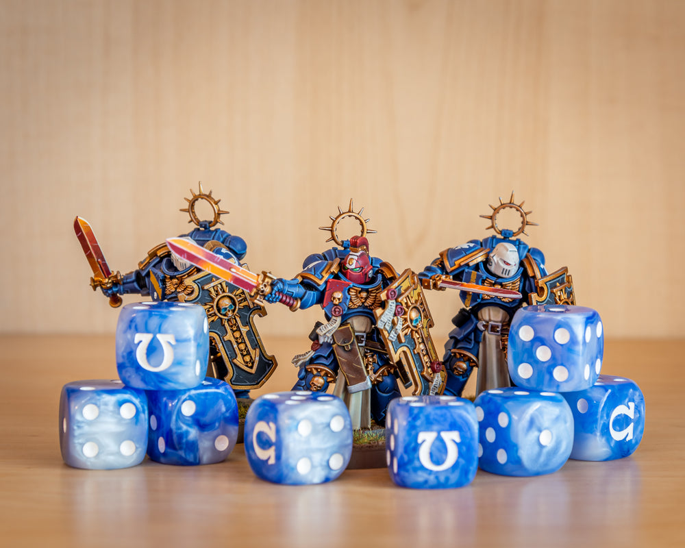These contain a blend of regal, deep, and righteous blues swirled with heroic white swirl and inlaid with crisp white; resin hand-swirled dice. The symbols are on the 6 side. These dice have an option of round corner, square corner, and 12mm MINI dice; choose wisely! Our premium dice now come in a unique reusable tin.