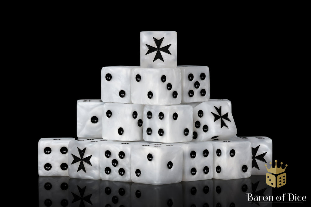 These contain a mix of chivalrous white swirled with a smokey white and inlaid in pure black; resin 16mm dice. The symbols are on the 6 side. These dice come in round corner, square corner or 12mm mini; choose wisely! Our premium dice come in unique reusable tins.