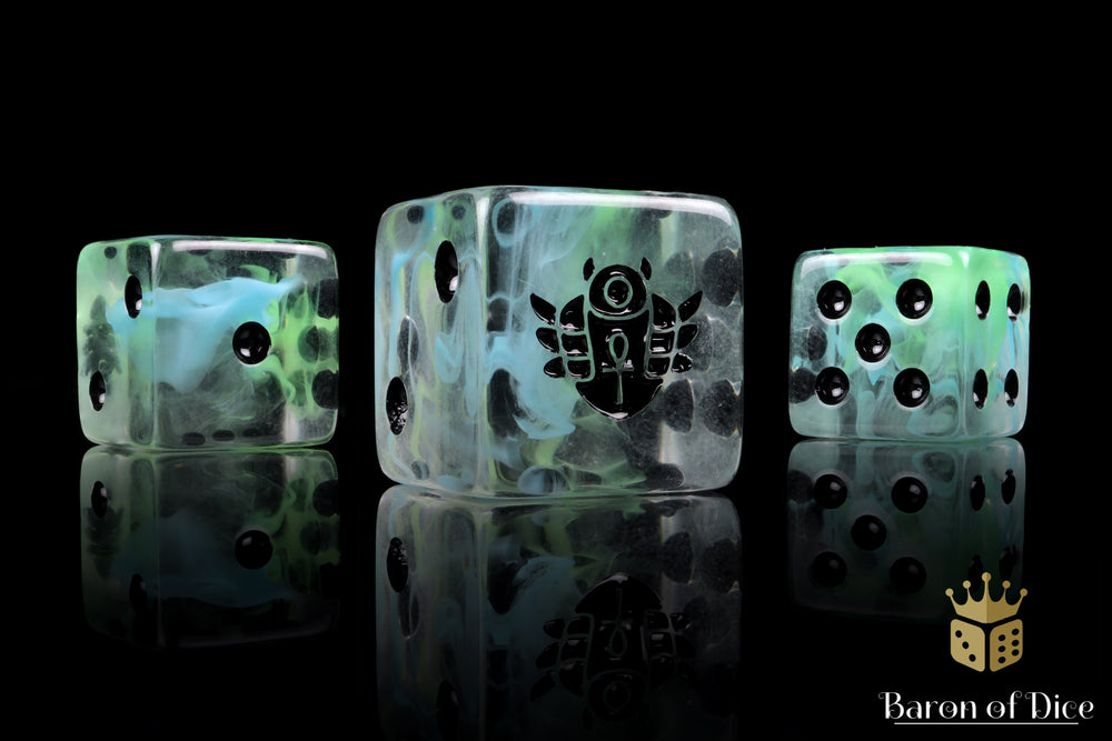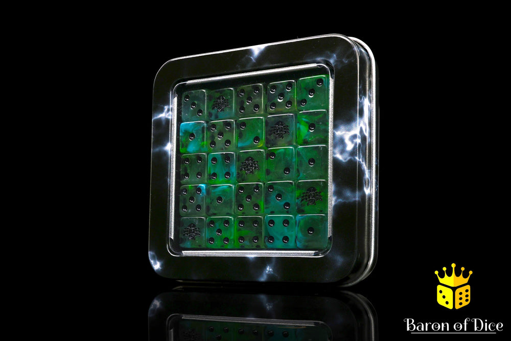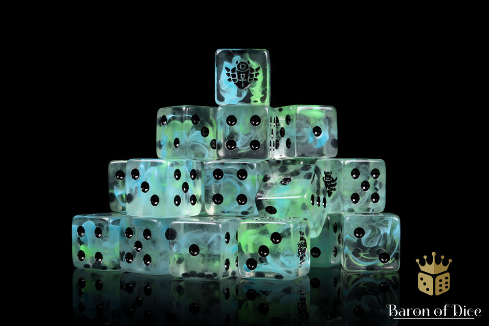 These contain a base of clear translucent swirled with a ghostly green and otherworldly blues and inlaid with a deep black; resin 16mm dice.  The symbols are on the 6 side. These come in round corner, square corner or 12mm mini; choose wisely! Our premium dice now come in a unique reusable tin.
