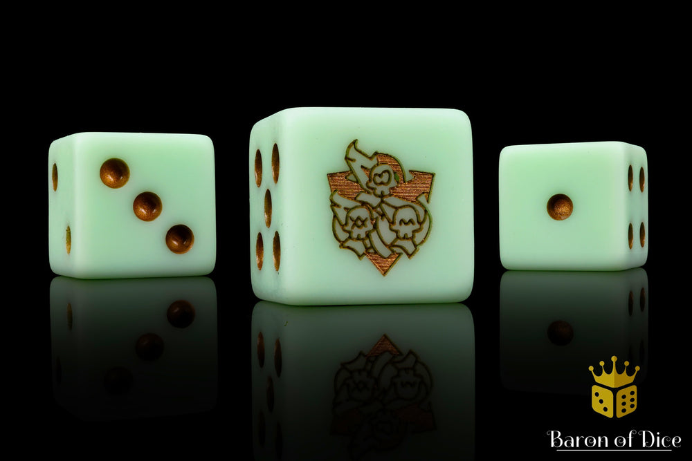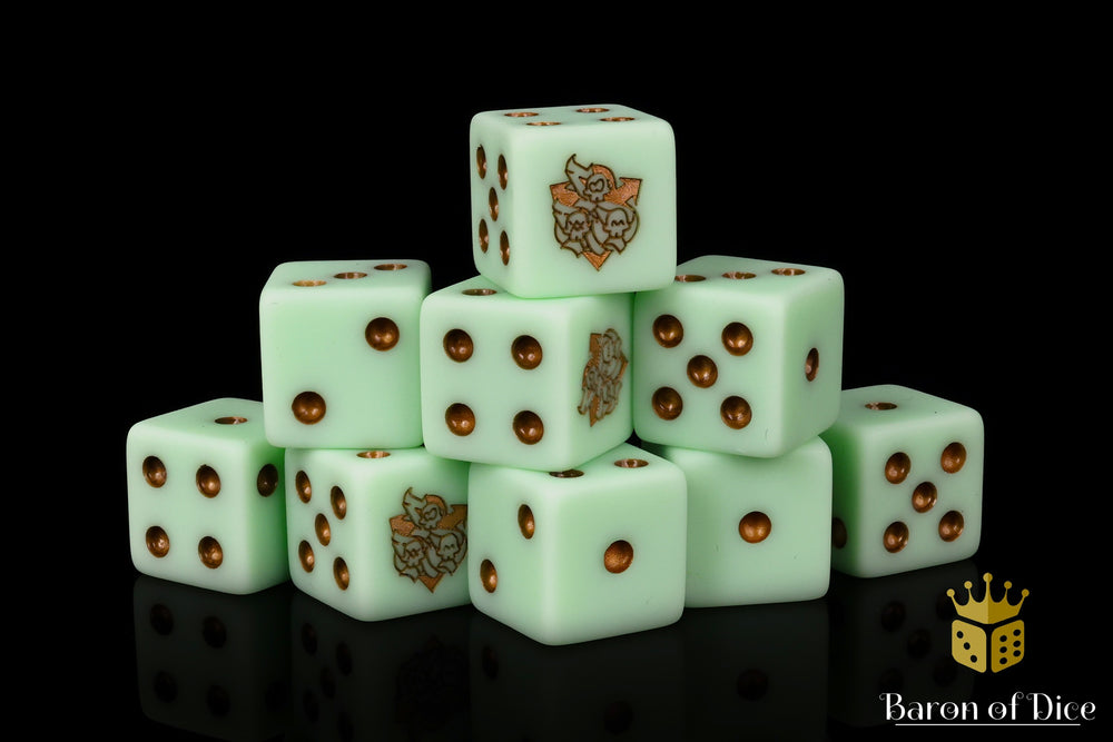 These contain a base of blighted greens in a matte finish and inlaid in the rankest metallic copper; resin 16mm dice.  The symbols are on the 6 side. These are the official Disgustingly Resilient Podcast dice! Our premium dice now come in a unique reusable tin.