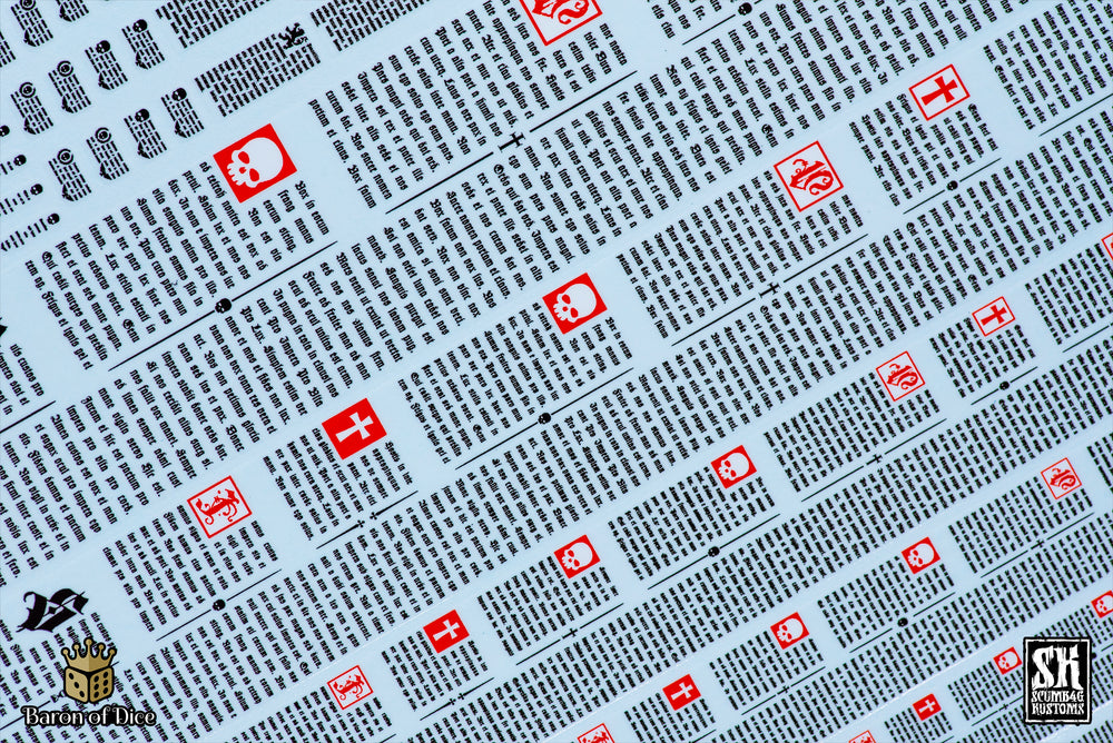 This Latin Scripture waterslide decal sheet is designed specifically for wargaming miniatures and features a selection of Latin text in multiple sizes and widths to suit a wide range of surfaces from infantry to large vehicles.