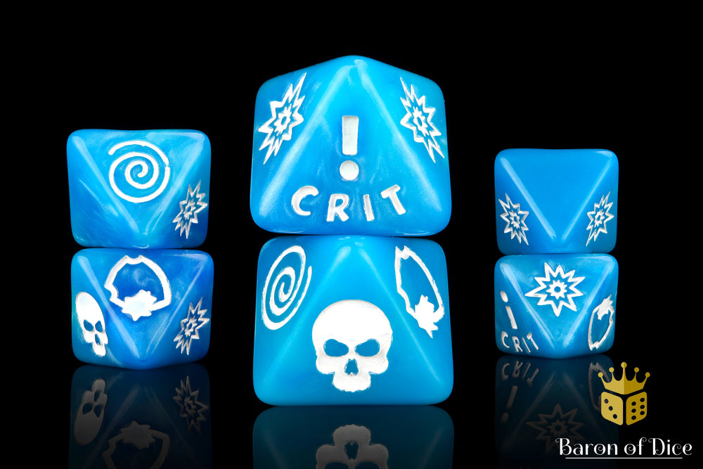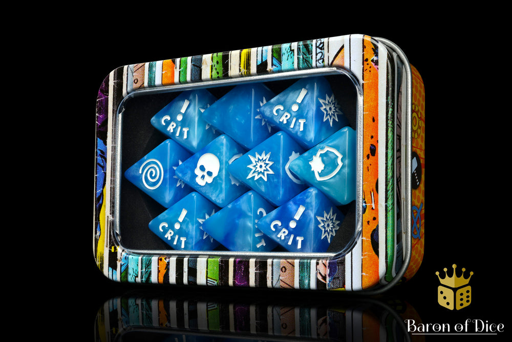 These contain a mix of pale blues swirled with vivid blues and inlaid with a crisp white. The symbols are all unique with a focus on a singular critical die face. Each set comes with x10 D8 dice encased inside an exclusive metal tin.