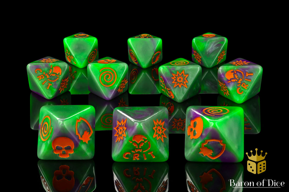 These contain a mix of vivid purples swirled with bright green hues and inlaid with a wicked pale orange. The symbols are all unique with a focus on a singular critical die face differentiating the designs. Each set comes with x10 count, D8 dice encased inside an exclusive metal tin.