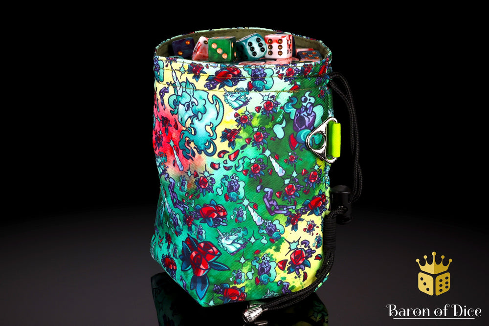 Roll with style during your next adventure with our brand-new luxury dice bag that's as fun as your wildest campaign. Bursting with hand-drawn artwork from talented tattoo artists across America, yes, pure human creativity with zero AI shortcuts. Hell yeah! Each bag design captures the chaos of RPG classes or monster mayhem from our team's favorite campaigns, there are dozens of designs to choose from!