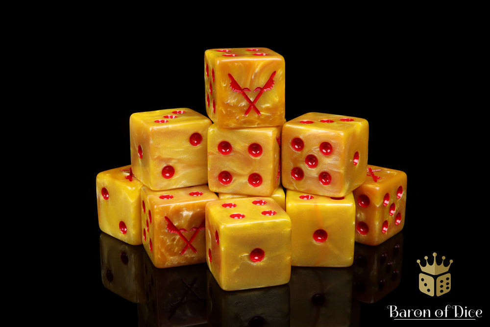 These contain a mix of golden and bronze hues swirled together and inlaid with a bright bloody red; resin 16mm dice.  The symbols are on the 6 side.  These are square dice. Our premium dice now come in a unique reusable tin when purchased in x25 and x50 count.