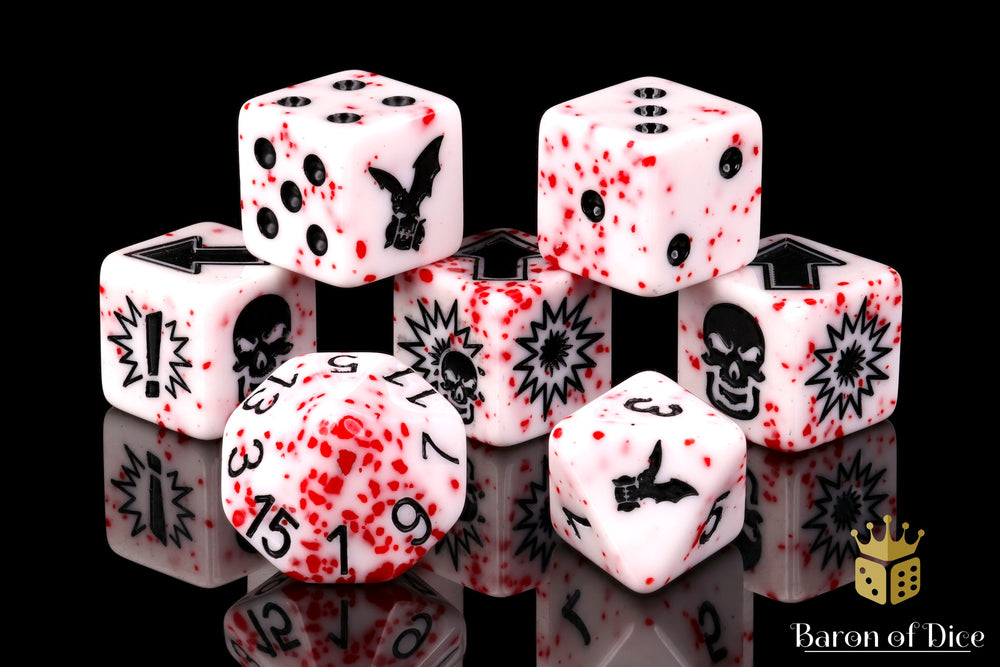 Our premium hand swirled resin dice contain a once pure white speckled with bloody flecks and cartilage smears and inlaid with a pure black. All symbols are on the 6, 8, and 16 sides, please choose a design to complement your army!
