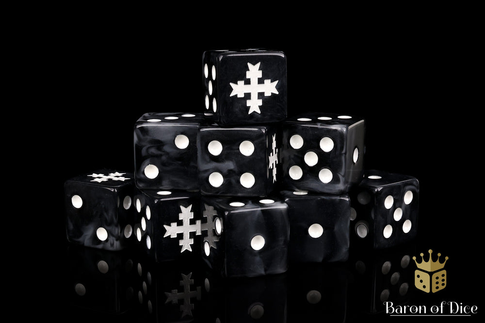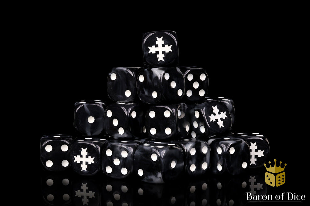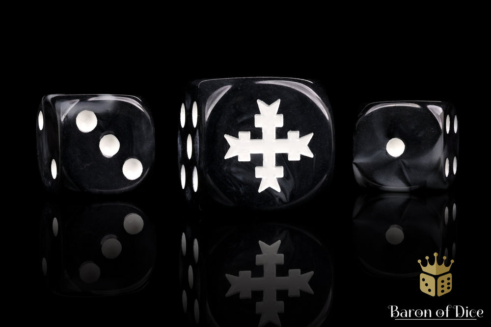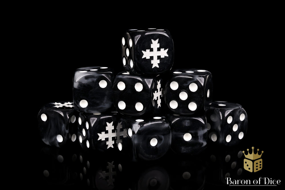 Full of righteous fury, these contain a mix of pure blacks swirled with veins of faultless silver and inlaid with a pure white; resin 16mm dice. The symbols are on the 6 side. These dice now come in round corner or square corner; choose wisely! Our premium dice come in a unique reusable tin.