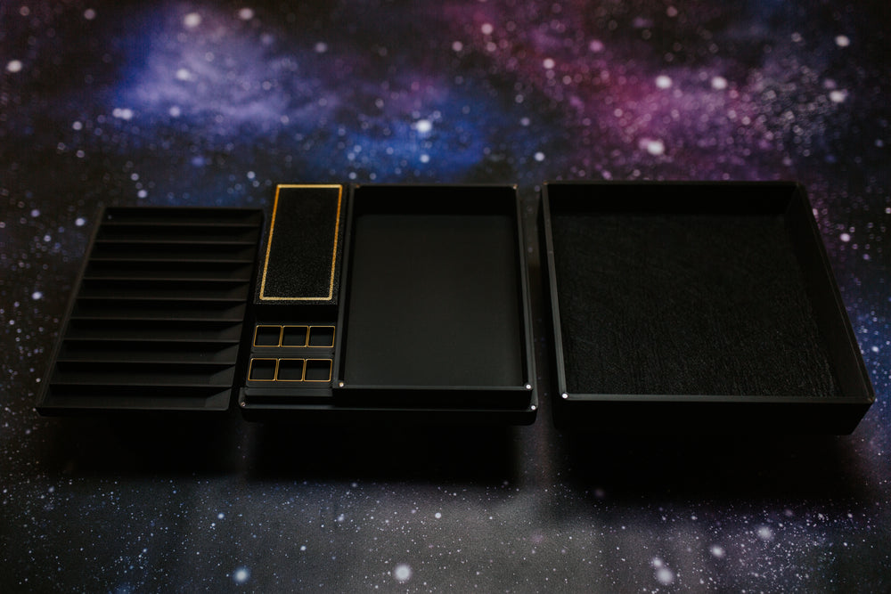 - Dice Tray — The lid doubles as a felt-lined dice tray with high edges, ensuring your dice remain contained during critical rolls.