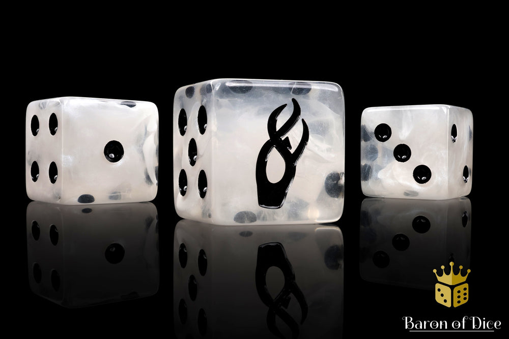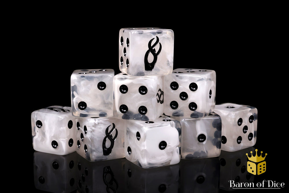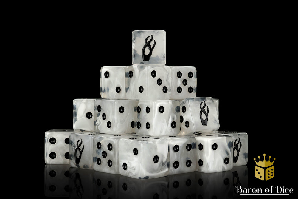 These contain a base of clear resin with magical grays swirled with veins of streaking white for a whispy final product and inlaid with a pure black; resin 16mm dice. The symbols are on the 6 side. These are square dice. Our premium dice now come in a unique reusable tin when purchased in x25 and x50 count.