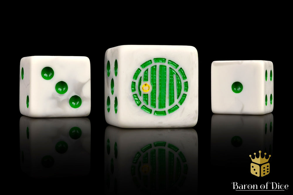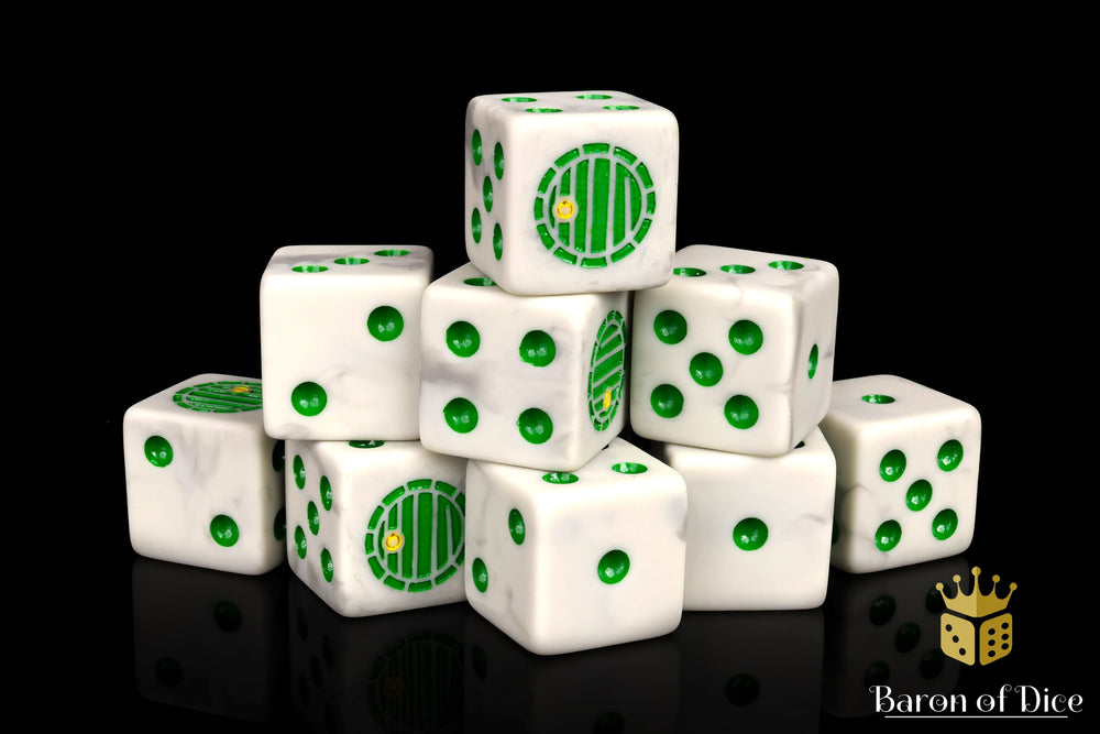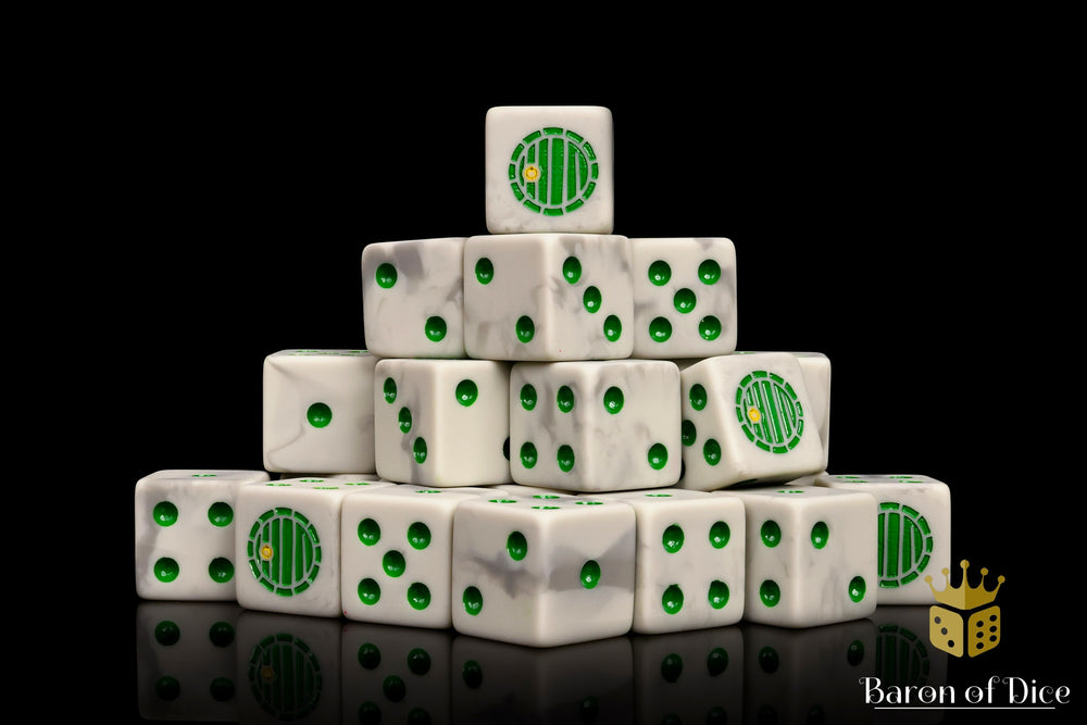 These contain a base of smokey whites swirled with streaks of thick pipe smoke and inlaid with a two-toned lush green and meadow yellow; resin 16mm dice. Matte finish. The symbols are on the 6 side. These are square dice. Our premium dice now come in a unique reusable tin when purchased in x25 and x50 count.