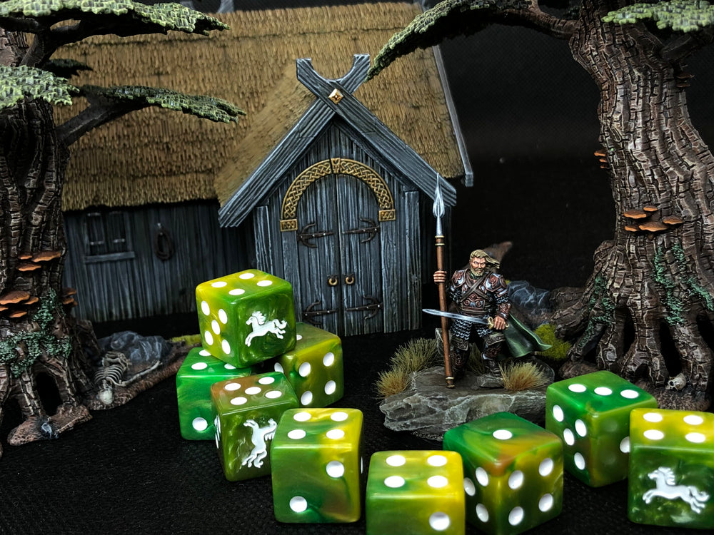 Each die is swirled with a bright green mixed with a meadow brown and golden hues and inlaid with a valiant white; resin 16mm dice. The symbols are on the 6 side. These are square dice. Our premium dice now come in a unique reusable tin when purchased in x25 and x50 count.