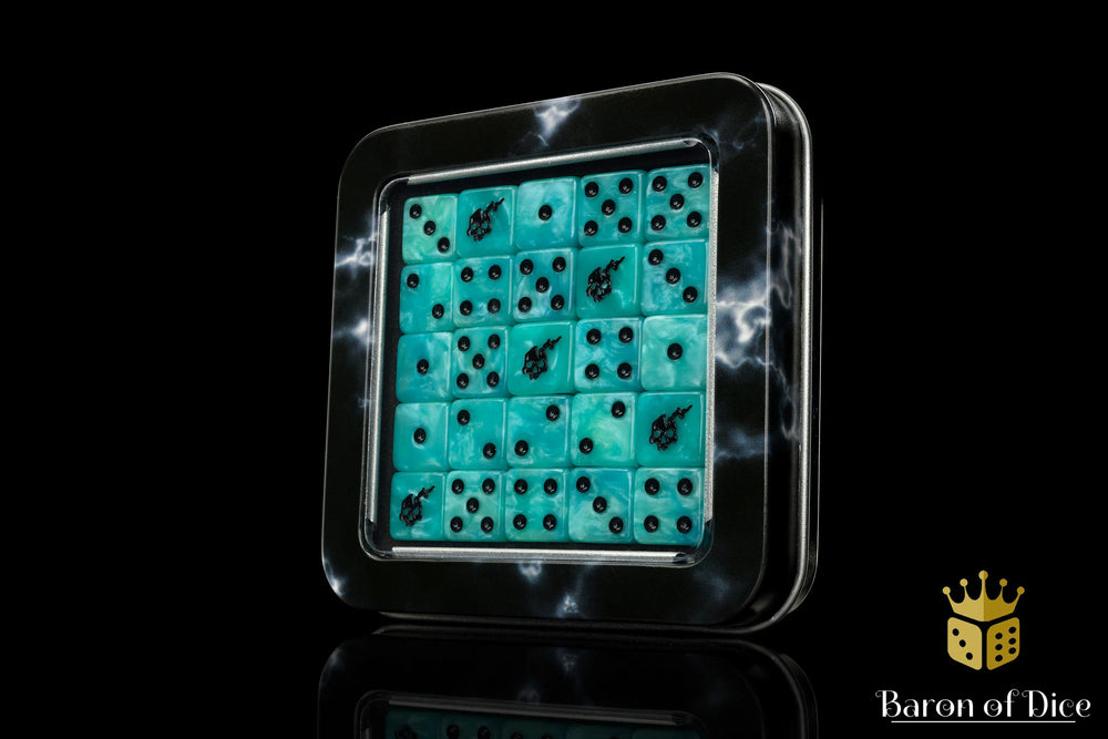 These contain a mix of ghastly greens swirled with tainted blues and inlaid with a pure black; resin 16mm dice. The symbols are on the 6 side. These come in round corner, square corner or 12mm mini; choose wisely! Our premium dice now come in a unique reusable tin.