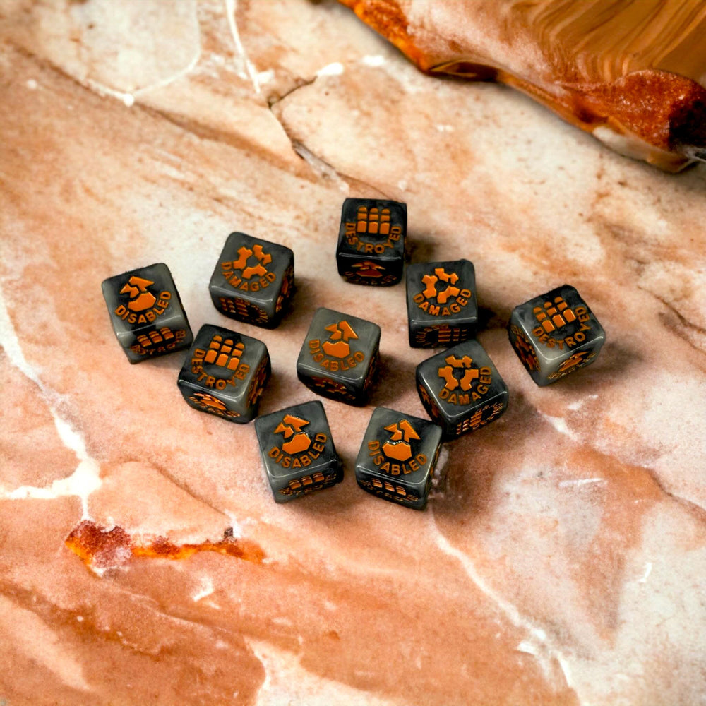 In a faraway galaxy, a war rages through the centuries... Where do your loyalties lie? This set of premium, hand-mixed, square edged resin dice feature special sides for the different vehicle damage results.