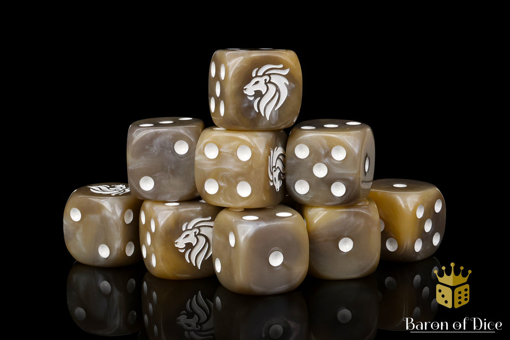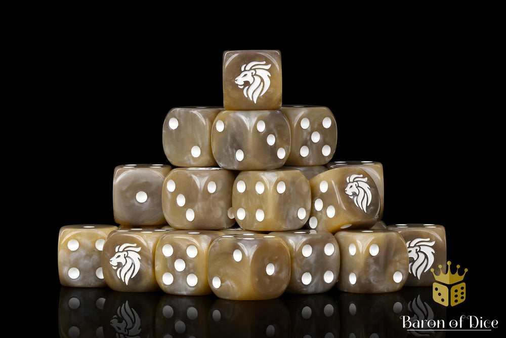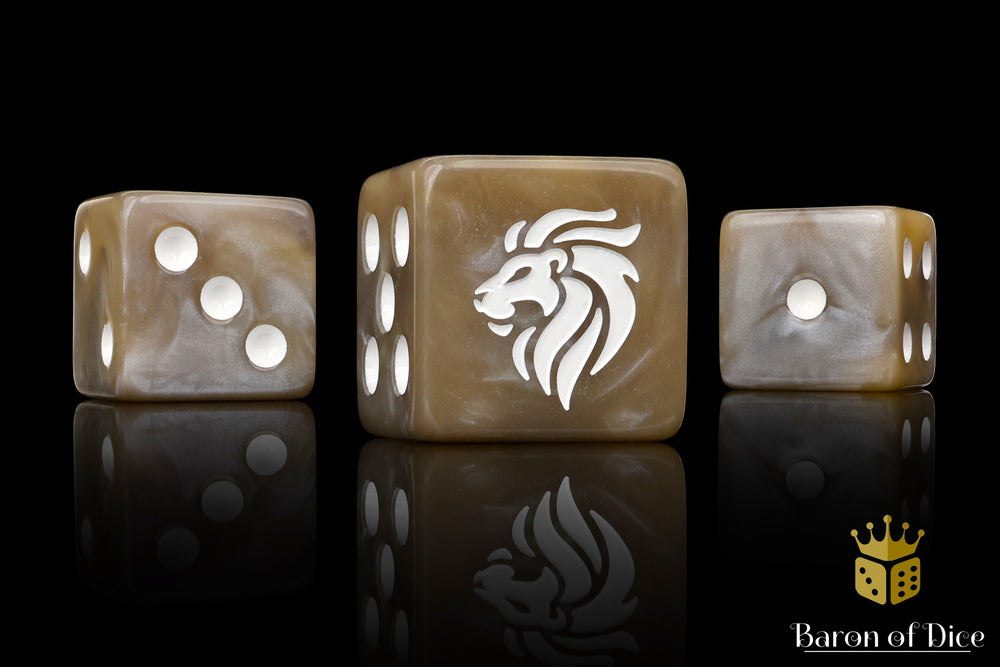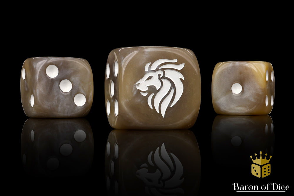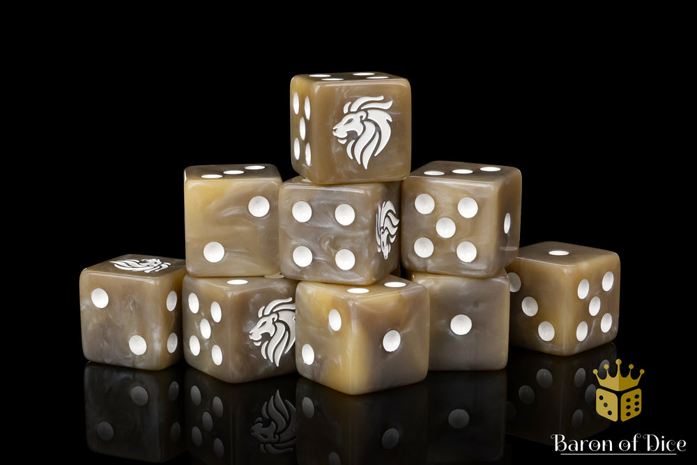 These contain a mix of dirty petrified swirled with a regal creme and inlaid with a pure white; resin 16mm dice.  The symbols are on the 6 side. These dice have an option of round or square corner, choose wisely! Our premium dice come in unique reusable tins.