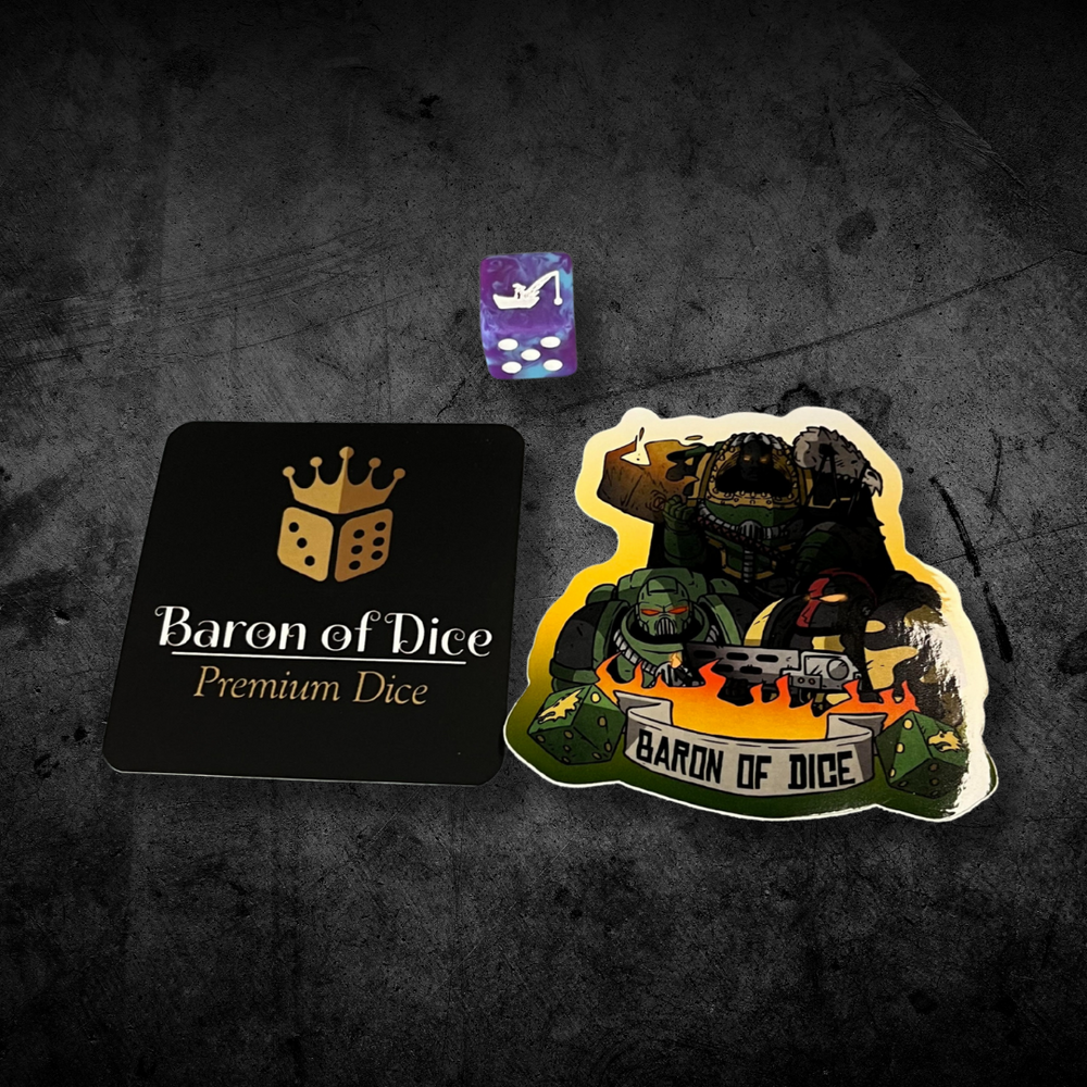 Each swag bag has a random game system compatible die, die cut premium sticker (also related to the game system) and Baron Biz card typically enough for each player.Β